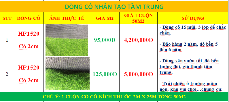 1. Bảng báo giá dòng cỏ nhân tạo phổ thông giá rẻ cung cấp tại Cửa Lò: