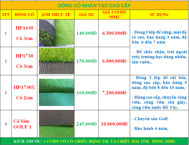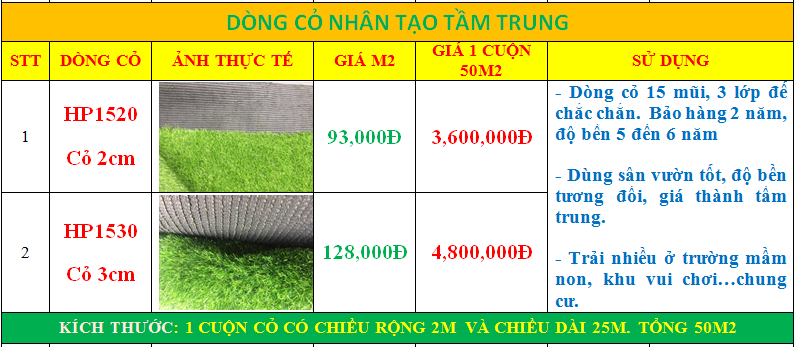 1. Bảng báo giá dòng cỏ nhân tạo phổ thông giá rẻ cung cấp tại Đô Lương: