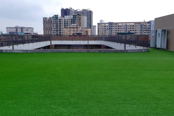 Cỏ nhân tạo trải sàn ngoài trời thường được trải tại khu vui chơi, sân vườn, trường mầm non.