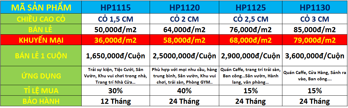- – Đa dạng chủng loại, có tất cả các dòng sản phẩm thảm cỏ trên thị trường, từ những dòng giá rẻ, dòng tầm trung, dòng cao cấp. Để khách hàng có thể lựa chọn được dòng cỏ phù hợp với mục đích sử dụng,giá thành.