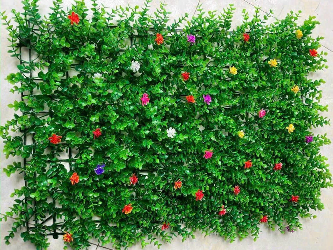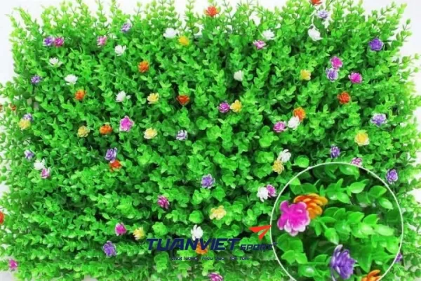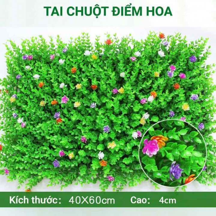 Hiện nay, cỏ tai chuột nhựa điểm hoa thường có kích thước tiêu chuẩn 40x60cm hoặc 60x60cm, độ dày đa dạng từ 3-5cm. Giá dao động từ 35.000 – 70.000 VNĐ/tấm, tùy theo mẫu hoa và độ dày.