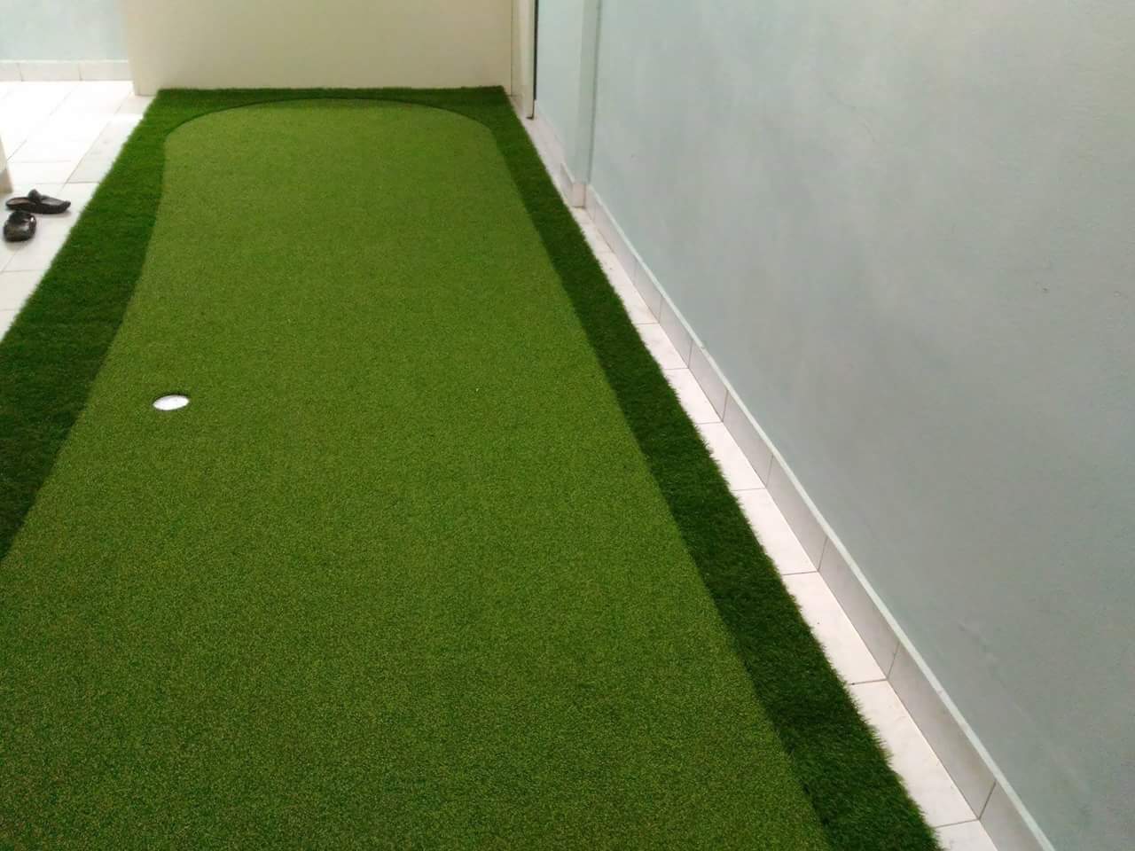 Một tấm thảm golf cỏ nhân tạo được trải tại nhà với chi phí thấp